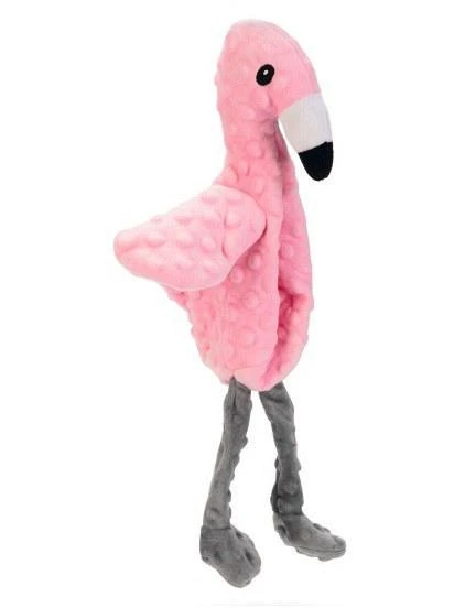 Beeztees hondenspeelgoed Flamingo Quak bevat alleen vulling in het hoofd en het lijfje bevat geen vulling. Dat is ideaal voor het baasje, want zo zal de vulling zich niet door de woonkamer verspreiden. Honden vinden het namelijk altijd erg leuk om vulling uit een speeltje te halen, maar dat kan bij deze knuffel nauwelijks gebeuren. Deze flamingo is gemaakt van zacht pluche en geschikt voor uren speel plezier.