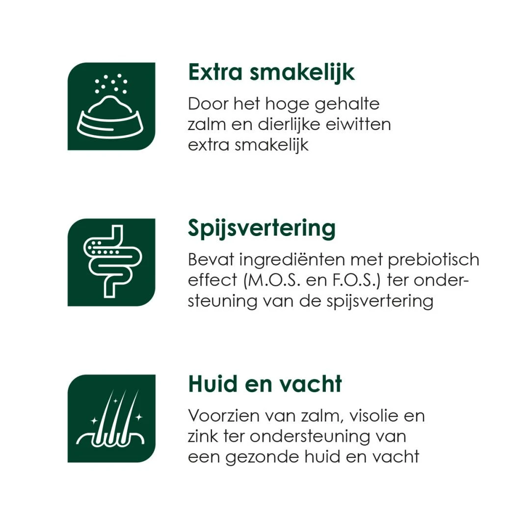 Gedroogde zalm (25%), rijst (25%), erwten (10%), dierlijk vet, gedroogde aardappel (4%), gehydrolyseerd dierlijk eiwit, bietenpulp, mineralen, geraffineerde cellulose, gedroogde biergist, visolie (0,1%), M.O.S., F.O.S., ß-glucanen, plantenextracten (Rosmarinus sp., Vitis sp., Curcuma sp., Citrus sp., Eugenia sp.).