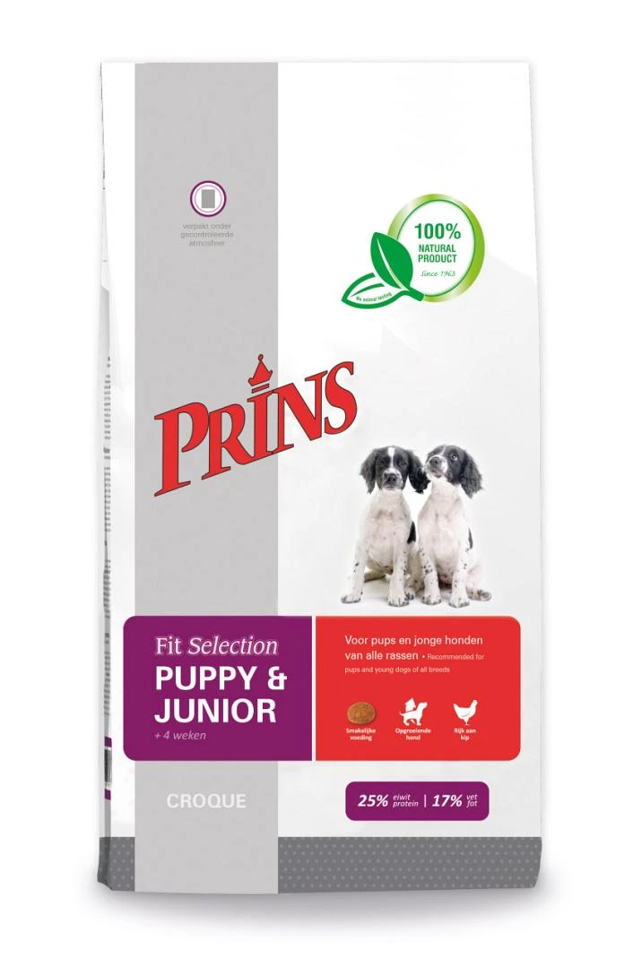 Prins Fit Selection Puppy & Junior is speciaal geschikt voor de opgroeiende familiehond en bevat alle bouwstoffen en energie die pups en jonge honden nodig hebben.